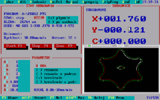 a számító gép képernyojén láthatók az összes fojamatok adatai, abszolút, programozott és szakasz koordinátákba és a megmunkált pálya hossza és a vágó sebesség
